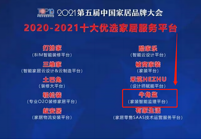 2021年:牛角監上海、杭州、成都等城市監理服務在2021年相繼開通。牛角監為了更好的保護裝修業主的隱私保障,率先升級小程序加密客戶手機號碼,為業主隱私重裝防火墻。與此同時,在“2020-2021中國家居服務十大優選品牌”中,牛角監連續2年作為唯一一家監理工程類企業榮獲上榜。8月,天貓牽手牛角監發力家裝行業 獨家首推“喵監理”品牌服務。牛角監作為天貓的第三方監理服務供應商,天貓通過采購牛角監的監理服務,為天貓的客戶提供更加專業和獨立裝修監理服務。